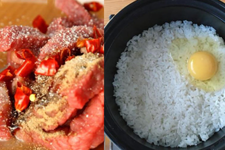 牛肉洗净切成条状,加适量辣椒碎、料酒、食盐、生抽、蚝油和胡椒粉,用手拌匀,腌制备用。大米装入砂锅里,加清水稍稍没过大米,开大火煮沸后改成中火焖煮,快要煮熟时,打入一个鸡蛋,加盖继续焖煮。