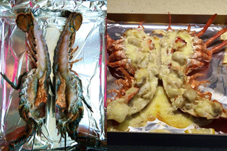 7、把蒸好的龙虾从蒸锅之中取出,放在铺设锡纸的烤盘中。在龙虾上加入之前炒制好的奶油蘑菇酱,再均匀撒上些许的奶酪丝。事先将烤箱预热,把龙虾放入烤箱中,烤至表面呈现金黄色泽便可取出食用了。