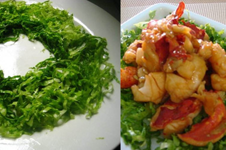5、把生菜清洗干净表面的杂质和泥沙,洗净后放在砧板上,用刀切成细丝状,铺在盘子中。把炒好的龙虾肉盛在盘子中,便可食用了。