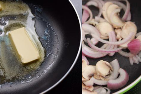 6、将黄油从冰箱之中取出,用刀切下一小块。把软化的黄油下入炒锅之中,油温烧热到七八成时。把洋葱丁、蒜末放入油锅中,小火进行反复煸炒。待其香味散发后,把切好的口蘑加入锅中,中火煸炒出水分后。再往锅中淋上些葡萄酒,等到酒精开始挥发后,往里下入适当的淡奶油。撒上些盐、胡椒粉进行调味,中火煮至汤汁浓稠后,便可关火盛出。