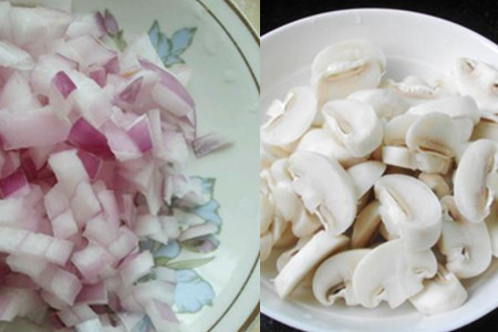 5、趁着蒸龙虾的时候,我们可以开始处理口蘑、洋葱。先将洋葱剥去外表皮,用刀切成小定状。把口蘑浸泡在淡盐水之中,浸泡十分钟左右便可捞出,放在水龙头下再次冲洗一遍,把冲洗好的口蘑用刀切成片状。把蒜剥去外皮,用刀剁成碎末,放在一旁待用。
