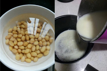 2、先将黄豆事先浸泡在清水之中,浸泡大概要几个钟头。黄豆浸泡软后,倒入豆浆机之中,加入适当的清水榨成豆浆,放在一边待用。