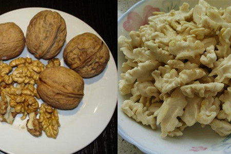 2、先将用夹子夹开核桃壳,取出里面的核桃仁。把新鲜的核桃仁浸泡在温水之中,浸泡二三十分钟左右。再把浸泡好的核桃仁捞出,用手剥去核桃仁的外皮,因为核桃仁的皮会有一点苦味。