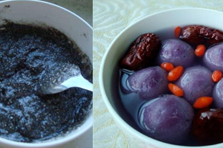 紫薯豆浆黑芝麻馅汤圆。