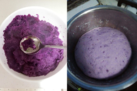 3、把紫薯削去外皮,洗干净后用刀切成块状。将足量的清水倒入蒸锅之中,水煮开沸腾后,把紫薯放入蒸锅中,大火蒸上二十分钟。把蒸熟的紫薯从蒸锅中取出,用勺子将紫薯捣烂成泥。紫薯一定要趁热捣烂,不然紫薯放凉后很难捣烂。