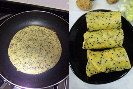 6、往平地锅中加入适当的食用油,油温开始微微冒泡后。把面糊舀入油锅中,煎至一面金黄色泽后,便可用铲子翻面继续煎至金黄。煎熟后把它卷起,切成段便可食用了。也可以使用电饼铛或者其他炒锅。