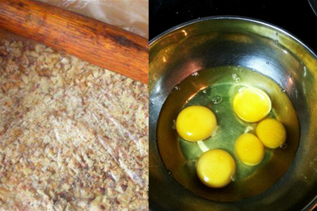 3、往锅中下入适当的食用油,油温烧热片刻后。把去皮的核桃仁全部下入油锅中,煎至外皮稍微发黄便可盛出待用。核桃仁放在一边晾晾后,倒入一个保鲜袋之中,用擀面棍压成碎末状。