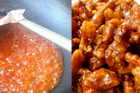 进锅之前,用手抖一下猪肉,将多余面粉去除掉。再炸肉的时候需要一遍定型、两遍炸熟,注意炸的时间,肉老了就不好吃了,只有掌握好时间,里脊吃起来才会酥香可口。里脊炸好后捞出来装盘,准备一些水淀粉,然后在锅内放入适量的番茄酱,加热后继续放白糖和适量的清水。用慢火烧开,不要用大火,番茄酱炒糊了,会非常不好吃。