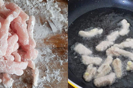 买回来清理干净后,切成大块儿,然后将猪肉块再切成筷子宽度的猪肉片,然后再横着,切成条状。切好的里脊肉,用盐,白胡椒,鸡蛋清以及生姜腌制,调味料一定要搅拌均匀。大概腌半个小时,调味品就会进入到肉里面了,这个时候再把腌好的猪肉条外层裹上一层干淀粉。我们需要用热油将猪肉条是先炸一下,所以不要挂住多余的淀粉。