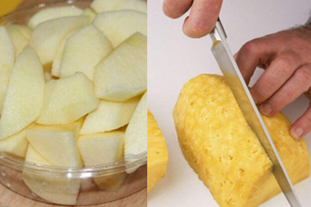 我们可以准备用苹果、菠萝加上姜,可以制作一款苹果菠萝生姜汁。首先我们需要把苹果削皮、去核之后再切成丁,把菠萝也切成丁,但是需要用盐水泡一下,大概15分钟左右就可以捞出来用清水洗一下。然后把生姜洗干净去皮切碎备用。接下来,就是把这三样放到榨汁机,并加入适量的水榨成汁就可以喝了。