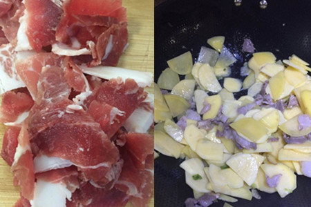 土豆不要买出芽的那种,这种里面已经产生毒素,一旦误食对人体非常不利。土豆把外皮去除后用清水清洗干净,然后切成土豆片,再把土豆片泡在清水里。土豆切开后会在表层产生一层淀粉,遇到空气里的氧气后会很快的变黑,所以在泡在水里。然后准备一块猪五花肉,切成薄片,把五花肉和辣白菜一起炒菜味道会非常好吃,再准备一些葱花就可以。