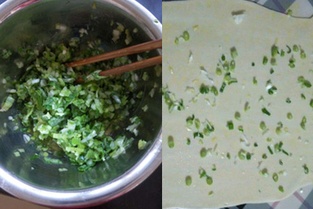 因为葱花里加入了食用油,所以还是比较好涂抹的,不要忘记边边角角,都要抹到。弄好之后,在上面再轻轻的撒上一层十三香,然后把薄饼切成几块,从饼的这边慢慢向另外一面裹起来。弄好后变成一个圆柱形面团,然后再用擀面杖擀平,这样一个葱油饼就做好了。用相同的方法把剩下的几张面饼都做好,然后我们就开始烙饼。