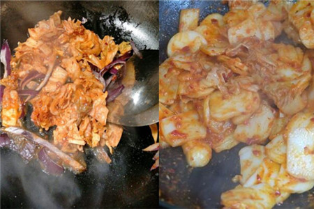 然后架锅倒入适量的食用油,食用油的分量可以适当的少一些,因为辣白菜在炒的过程当中会逐渐的开始出汁。然后等锅内的油开始沸腾之后,就可以将准备好的大蒜末和姜末倒入锅内,等到香味溢出的时候就加入辣白菜。辣白菜本身就是熟食,所以只需要简单的翻炒几下即可,然后就可以将我们准备好的年糕倒入锅内翻炒。