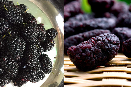 所以果农们为了是桑葚的过期更长,就想出来制作桑葚干的办法。桑葚干也是比较受欢迎的。桑葚做成桑葚干除了口感有一些细微的区别以外,桑葚的功效一点也没有减弱。桑葚干作为一种蜜饯,它不只是一种零食,它的营养价值也很高。