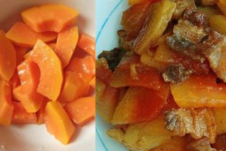 木瓜也能做为下饭的菜肴,如木瓜炒肉,但一般要选用比较生的木瓜。木瓜炒肉的做法很简单,首先将木瓜削皮、洗净、切片,浸泡于盐水中,去除涩味。将生肉洗净切片,用盐、姜末、醋、生粉腌制15分钟。在锅中热一点油,放入蒜片爆香,然后放入木瓜片翻炒,炒至5分熟,放入生肉,加点水,翻炒至生肉变熟即可。