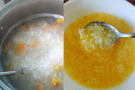 然后将大米和小米的混合物倒入锅内,煮大概半个小时左右,这时候米粥已经快熟了,再把蒸好的南瓜放进去,用勺子搅拌均匀。南瓜已经蒸好,所以比较容易熟,我们只需要将南瓜弄碎,再与米粥煮十分钟即可。
