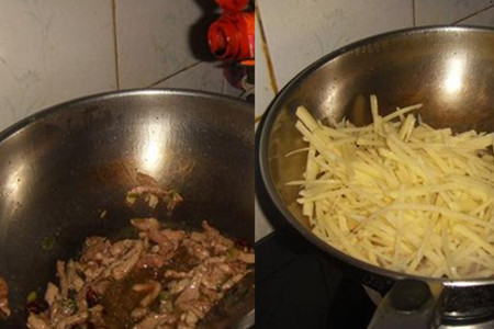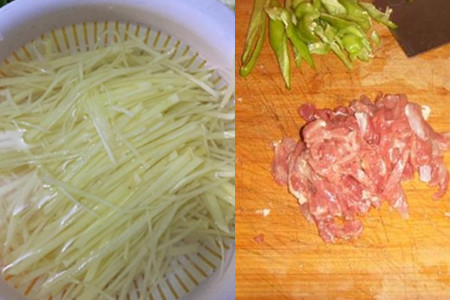 挑选马铃薯的时候一定要看清楚马铃薯是否发芽,是否有撞击的痕迹,这样的马铃薯质量都不是非常好,尽量不要选择。猪肉选择有一点瘦的五花肉,这样炒菜会更加香。选好食材以后就要将他们处理一下。将马铃薯的外皮削干净,然后清洗一下,再将它切成细丝。将猪肉清洗一下,切成细丝备用。