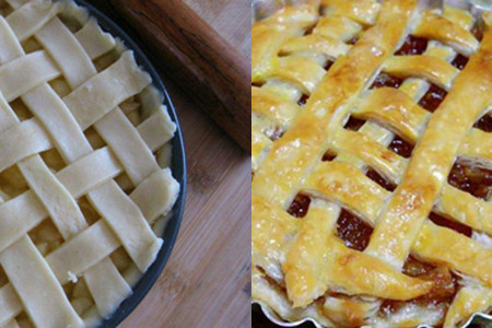 取出事先做好的苹果片,然后均匀的铺在厚饼上面,苹果片要沥干水分。将切好的长条面穿插放在苹果片的上面,用刷子在苹果派上面轻轻的刷一层食用油,在预热好的烤箱内用200度的温度烤半个小时就可以了。