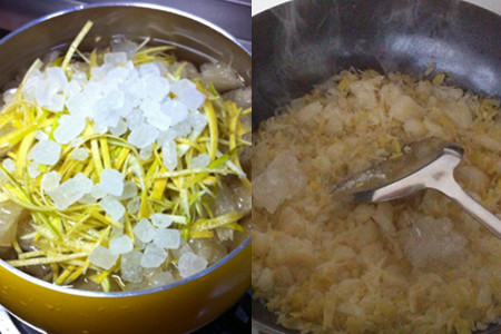 接下来我们就把适量的水和冰糖放到锅里面去,把柚子皮倒进里面去稍微煮一下。这步骤需要注意的是柚子皮和柚子肉的比例为1:4,这样做出来的柚子茶就不会太苦,很多人都能接受。