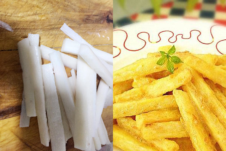 首先往锅中倒入适量清水,开火将水烧开。随后倒入山药,煮两分钟左右就可以捞出来了。再用刀将它的皮刮去,并把它切成条状。把山药条放入油锅之中,待其变成金黄色之后就可以捞出来了。