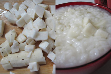 首先将山药的皮刮去,再把它切成块状,将它放入水中浸泡,防止它因为氧化而发生变色。随后,就可以开始煮粥了。当粥煮到六成熟之后,把山药从水里捞出来,并倒入粥中。待其煮熟之后,加入适量的白糖,并将其搅拌均匀。