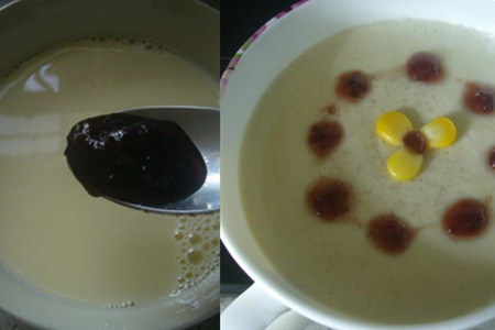 食材:鸡蛋45克、牛奶150ml、果酱15克、玉米粒、白糖。
