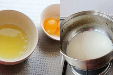 鸡蛋去壳,将蛋黄和蛋清分离开,蛋清用筷子搅拌均匀待用。牛奶倒入煮锅,开小火加热至烧开后关火,将牛奶转入碗内。牛奶晾凉后,面上会形成一层奶皮,用小刀沿着碗边划一个十厘米左右的口子,倒入碗里的大部分牛奶。