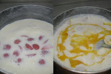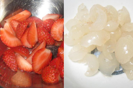 食材:牛奶500ml、草莓100克、鸡蛋50克、龙眼100克、莲藕粉、白砂糖。