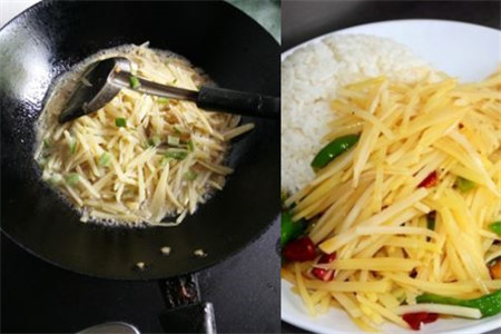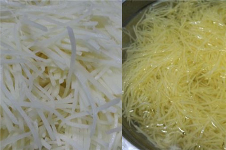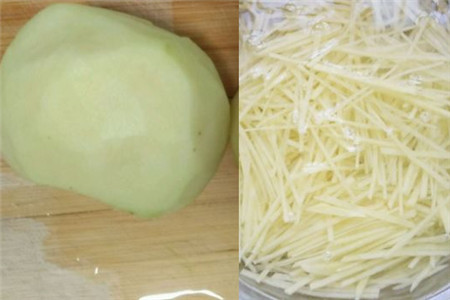 等土豆丝切成丝后,就需要拿清水把切好的土豆丝浸泡在盆子中,只需要泡上二十分钟左右就行。然后再把土豆丝洗几遍,把土豆中的淀粉给洗掉,这样在炒土豆丝的时候就不会粘锅了。在炒土豆的过程中也要掌握好火候,炒土豆丝需要大火,并且还要快速的来回翻炒,这样炒出来的土豆才会香脆。还有在炒的时候也不要放太多的辣椒,不然吃后很容易上火。