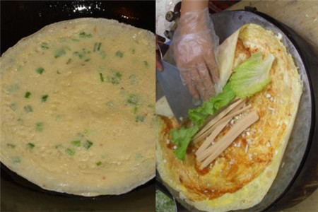 做煎饼的第六步是将平底锅上抹上一层油,舀一大勺面糊在锅里,就将锅迅速的转动起来,让面糊成一个圆形。煎饼的一面定好型后,就把煎饼翻一面在烙上一分钟。第七步是把土豆洗干净,然后切成丝,再把它倒在锅里面炒。第八步是做蘸汁。第九步是准备好需要的菜,我们就可以开始卷煎饼了。第十步是把煎饼摊开抹汁,再放上各种菜,就可以卷起来吃了。