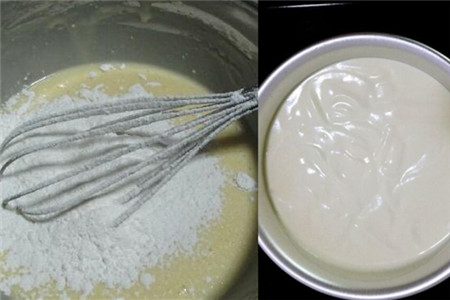 将它们搅拌均匀之后就可以,然后再将刚刚做好的奶油拿出来,倒一半奶油在鸡蛋液盆子里面,然后再将它搅拌均匀,这时我们就可以把它放在烤箱里面去烤了。这时我们烤出来的只是普通的戚风蛋糕,想要做出奶油蛋糕,肯定要把戚风蛋糕和奶油相结合。