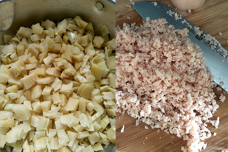 2、先在买回来的新鲜的冬笋上,用刀轻轻地划开一道,再用手剥开冬笋的层层外壳,切去根部比较老的部位。冬笋清洗一下后,便可用刀剁成碎末状。