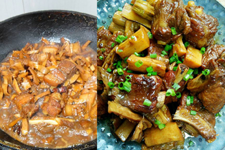 5、翻炒出香味,排骨微微焦黄后,淋入些生抽进行调色。用铲子继续翻炒,如果觉得锅里比较干,就往里加入些许清水。排骨均匀上色后,把泡发软的笋干放入锅中。这时候再往锅中倒入足量的清水,水的量一定要没过食材。