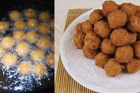 6、用手抓馅料,从虎口处挤出一个小丸子。把挤好的丸子依次摆在盘子中,将适量的食用油倒入锅中。油温烧热开始冒泡后,把丸子轻轻地下入油锅中,炸至表面金黄后。再用漏勺捞出控油,待油温再次升高后,把丸子再复炸一遍。把炸好的丸子捞出,稍微放凉后便可食用了。