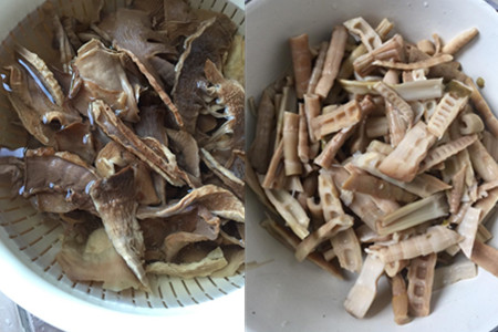 2、先将笋干事先浸泡在水中,浸泡大概要十二个小时左右。浸泡的过程中,要多次换水。如果笋干比较老的话,也可以用高压锅先炖煮一下。把泡软的笋干从水中捞出,控干上面的水分,用刀切成段状。