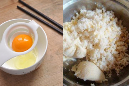 4、把豆腐渣放在纱布中,把纱布包起来,用手挤出里面的豆汁。在一个碗中打入几个鸡蛋,用蛋清分离器将蛋黄取出,仅仅只留下蛋清。葱择净不新鲜的叶子,剪去须洗净后,用刀切成葱花状。