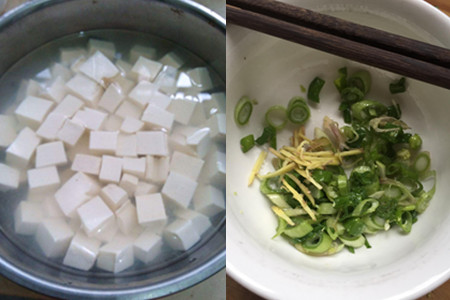 4、新鲜的嫩豆腐用刀切成小块,但是不能太小,以免豆腐煮的时候太碎。生姜切成细丝,葱择去不新鲜的叶子,剪去根须洗净后,用刀切成葱花状。