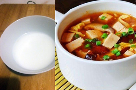 5、往锅中逐一倒入适量的清水、生抽、醋、白糖、油辣椒,大火煮至汤汁沸腾后。再把豆腐粒下入锅中,这时候再加入些许的胡椒粉、盐进行调味。在一个碗中加入些许的淀粉和清水,用筷子搅拌均匀成水淀粉。把制作好的水淀粉倒入锅中,再打入一个鸡蛋,用筷子快速地搅散蛋液。淋出锅前,撒上些香油提香,便可出锅食用了。