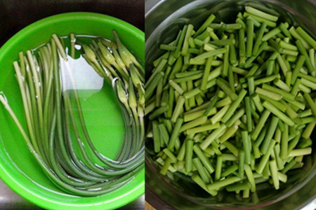 2、先将从市场买回的新鲜的蒜苔浸泡在淡盐水之中,洗净表面的农药残留物。蒜苔浸泡半个小时后,再用手捞出放在流水下冲洗一遍。把洗净的蒜苔控干多余的水分,放在砧板之上,用刀切成长短适当的段状。