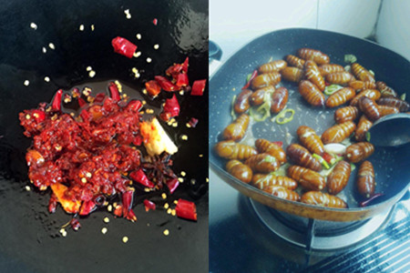 3、将适量的冷水倒入煮锅之中,把蚕蛹全部加入其中。盖上盖子,大火烧开水沸腾冒泡后,立刻用漏勺将蚕蛹捞出。因为蚕蛹比较容易煮熟,而且我们又是冷水的时候就下锅了,所以当水烧开后,一定要快速地把它捞起,以免煮太久使其口感变老。