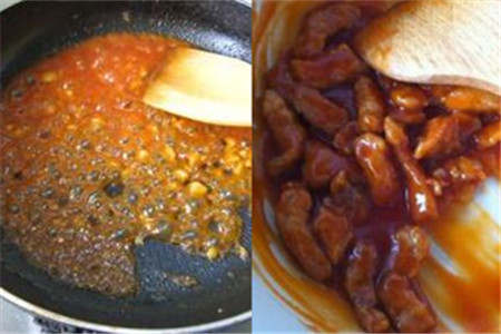 之后将煮好的番茄酱浇在炸好的里脊肉上,搅拌均匀,如果想做糖醋里脊盖饭,可以将它们搅拌均匀之后,再放在煮好的米饭上,就可以享受美美的一餐了。
