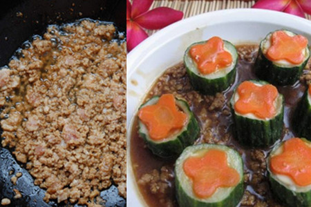 8、把蒸好的酿黄瓜从锅中取出,把烹调好的肉酱浇在酿黄瓜上,便可食用了。
