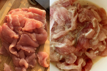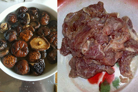 2、香菇事先浸泡在清水之中,浸泡软即可。把泡发好的香菇用刀切成细丝,置于一旁备用。把瘦肉洗净上面的血水,用刀切成薄片,加入适当的地瓜粉进行均匀地抓捏。这样做出来的瘦肉会更加嫩滑爽口。