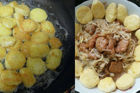 5、将适当的食用油倒入炒锅中,油温加热到七八成时。把日本豆腐慢慢地逐一下入油锅中,煎至豆腐两面金黄后,便可控油盛出。利用锅中剩下的油,把香菇放入锅中炸一遍。这时候往锅中倒入少量的清水,把金针菇全部下入锅中。金针菇断生后,再往锅中逐一加入豆腐、瘦肉,撒上些盐、淋些酱油调味。翻炒均匀后,盖上盖子焖上几分钟,撒上些葱花便可食用了。