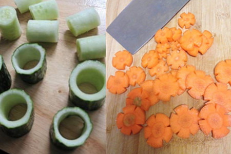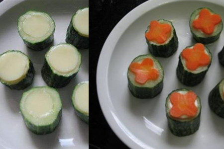 2、把新鲜的黄瓜洗净,切成长段状。用勺子将黄瓜的中间的瓜瓢挖掉,挖的时候尽量把它挖成圆柱形。把买回来的日本豆腐切成与黄瓜一般的长度的小段,置于一边待用。胡萝卜去除外皮,先用刀切成片状,再用刀划成花片形状。