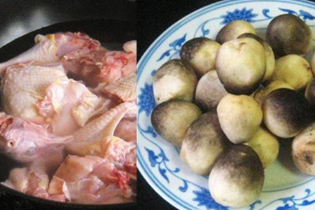 草鸡宰杀好,处理赶紧,剁成大块。锅内加适量清水烧开,下草鸡块焯一下,焯掉血沫,捞起滤干。草菇清洗干净,切成片状待用。