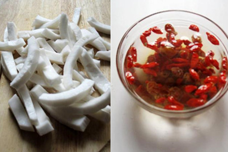 椰子倒出椰汁,一切为二,取半个切成细条待用。红枣清洗干净,去掉枣核。桂圆和枸杞放入清水里浸泡一会儿,捞起滤干水分备用。瘦肉清洗干净,切成小方块。