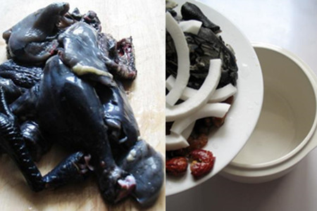 食材:乌骨鸡1只、山药100克、红枣30克、黑木耳30克、葱段、生姜、料酒、盐。