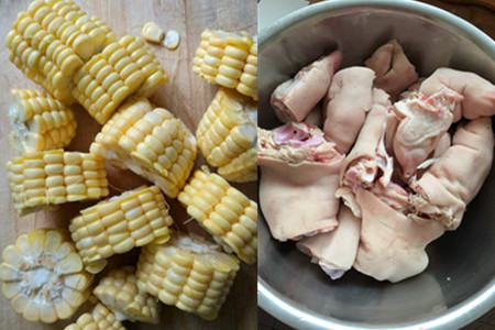 2、先将买回来的新鲜的玉米剥去外皮,撕去毛须,洗净后用刀剁成小块。猪蹄用夹毛器夹干净上面的小杂毛,放在砧板之上,用刀斩成小块状,置于一旁待用。