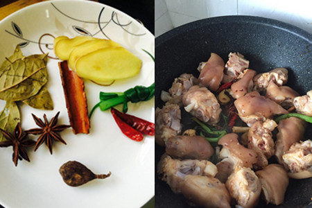 4、将些许的食油倒入炒锅之中,油温烧热开始冒泡后。把生姜片、干辣椒、豆豉、桂皮、八角下入油锅中,用铲子进行煸炒。待其香味慢慢散发后,把准备好的猪蹄块加入油锅中,大火爆炒至断生。
